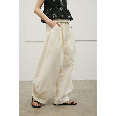 モデル身長164cm(Mサイズ着用)ウエストにフリップベルトのディテールを効かせたデザインタックパンツ。軽やかで程よいハリ感のある素材を使用しており、動きに合わせてニュアンスのある表情を見せてくれます。立体的なタックがシルエットをきれいに整え、モードな印象をキープしながらもデイリーに取り入れやすい一本。シャツやジャケットを合わせれば洗練されたスタイルに、Tシャツやニットでカジュアルに着こなすのもおすすめです。ストレッチなし、透け感なし。【お手入れ方法】マシンウォッシュ可