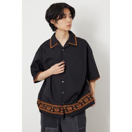 ■ポイント細かなクラウン刺繍が施られた、ボックスシルエットの開襟シャツ。■ディテール裾、袖口、襟まわりに細かく繊細なクラウン刺繍が施されたディテールがポイント。一見シンプルながら、こだわりの詰まった一枚に仕上げました。■スタイリングデニムやカーゴパンツ、チノパンツなどと合わせたカジュアルな着こなしはもちろん、スラックスなどのキレイ目スタイルにも合わせやすいです。■生地細かく織り込まれた綿100%のハイカウントウェザー生地を使用しています。高密度の細糸でしっかりと織られた生地で、適度なハリ感と美しい微光沢が魅力の生地です。■透け感:ややあり■裏 地:なし■伸縮性:なし■光沢感:ややあり※お取り扱い上のご注意刺繍部分は無理に伸ばしたり、濡れた状態での極度の摩擦をかけますと刺繍糸が切れたりする恐れがあります。先の尖ったものや、ざらついたものに引っ掛かると糸が飛び出す恐れがあります。[注意事項]※画像の商品はサンプルです。実際の商品と仕様、加工が若干異なる場合があります。※画像の商品は光の照射や角度、お使いのモニター環境により、実物と色味が異なる場合がございます。※着用、お取り扱いの際は、アテンションタグをご確認ください。