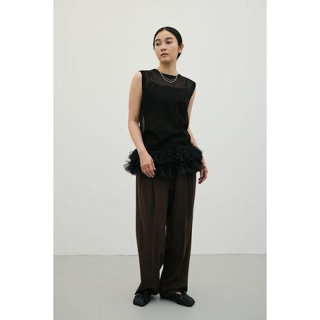 [型番:500JSM30-3301]WHT:モデル身長163cm(FREEサイズ着用)BLK:モデル身長164cm(FREEサイズ着用)シャツやカットソー、ジャケットなどと重ねて裾から出るフリンジのレイヤードコーディネートが楽しめるキャミソール。程よくフィット感があり薄手のトップスの中にもインしやすいサイズ感。身頃のチュール素材も柔らかく、伸縮性があるのでストレスフリーに着用いただけます。透け感あり。ストレッチあり。【お手入れ方法】手洗い可