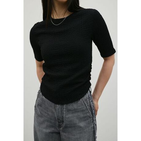 [型番:500JSA80-3121]L/GRN,WHT:モデル身長163cm(Mサイズ着用)BLK:モデル身長164cm(Mサイズ着用)凹凸感のあるカットソー素材を使用した、表情豊かなコンパクトTシャツ。ウエストにギャザーを寄せたシェイプデザインで、自然にメリハリをつけながらスタイルアップを叶えます。すっきりとしたサイズ感で、ウエストインでもアウトでもバランスよく着こなせる一枚です。ストレッチあり、透け感WHTややあり。【お手入れ方法】マシンウォッシュ可