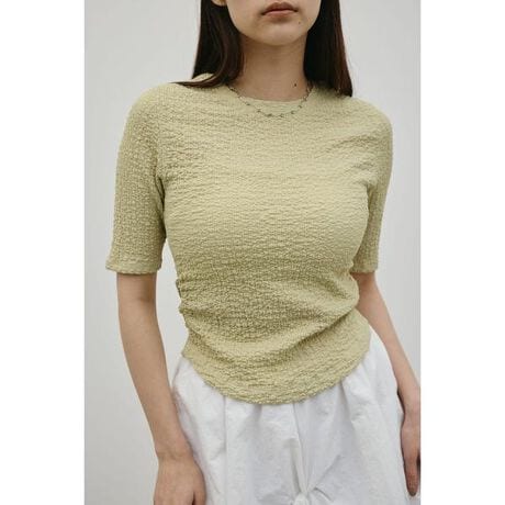 [型番:500JSA80-3121]L/GRN,WHT:モデル身長163cm(Mサイズ着用)BLK:モデル身長164cm(Mサイズ着用)凹凸感のあるカットソー素材を使用した、表情豊かなコンパクトTシャツ。ウエストにギャザーを寄せたシェイプデザインで、自然にメリハリをつけながらスタイルアップを叶えます。すっきりとしたサイズ感で、ウエストインでもアウトでもバランスよく着こなせる一枚です。ストレッチあり、透け感WHTややあり。【お手入れ方法】マシンウォッシュ可