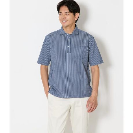 サッカー素材特有の凹凸感が涼しげな印象を与えるストライプポロシャツ。細幅ストライプにアップデートすることで、カジュアルになりすぎず、すっきりとした表情に仕上げました。暑い季節でも快適に着られる、軽快な一着です。