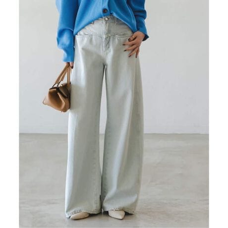 シーズンムード漂うワイドシルエットは今年らしいスタイへ昇華。淡いサックスブルーカラーが優しい印象なので、ヒールや抜けのあるサンダルで女性らしく着こなすのがおすすめです。