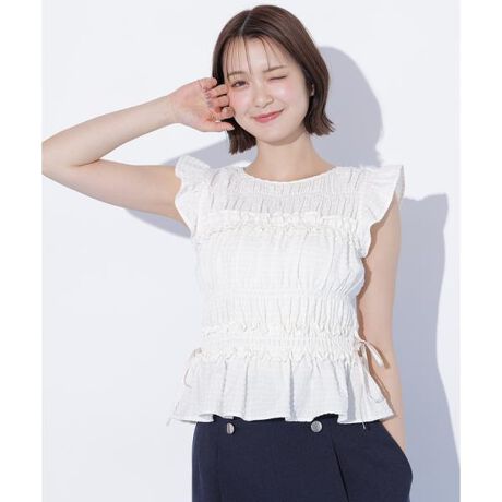シャーリングとフリルを贅沢にあしらった華やかなフェミニンブラウス。立体感のあるデザインで、一枚でコーディネートの主役になります。やわらかなシルエットが女性らしく、サイドリボンもアクセントに。デニムと合わせても可愛らしく決まります。※撮影時照明の関係により、色味が違って見える場合がございます。またパソコン・スマートフォンなどの環境により、若干製品と画像のカラーが異なる場合もございます。予めご了承ください。商品の色味は、商品単品画像をご参照下さい。※商品画像はサンプルのため、色味やサイズ等の仕様に変更がある場合がございますので、予めご了承ください。