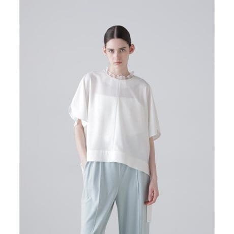 ドライタッチでソフトでしなやかな合繊素材で仕立てられたデザインブラウスです。