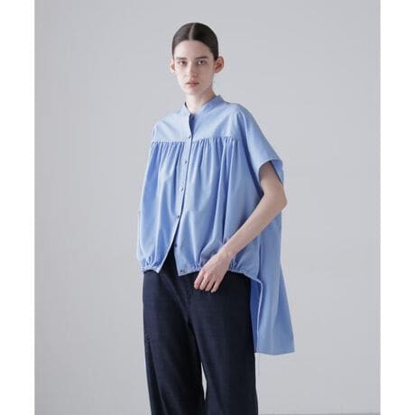 ギャザーデザインが涼し気な印象のコンパクトクリスピークロスブラウス
