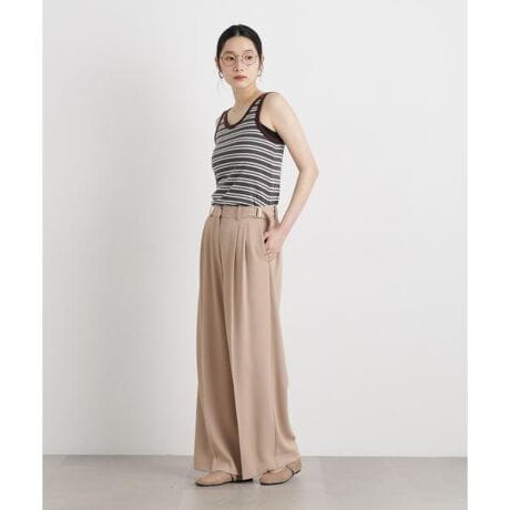 程よい微光沢と落ち感が魅力の、きれいめ2タックワイドパンツ。オフィスからタウンユースまで幅広く活躍し、シンプルながら洗練された印象に仕上がる一本です。