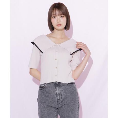大きめの襟が目を引くリブニット。顔まわりを華やかに見せ、一枚でコーディネートの主役に。フィット感のあるシルエットが女性らしさを演出。デニムでカジュアルに、スカートでフェミニンスタイルにも着回せます。※撮影時照明の関係により、色味が違って見える場合がございます。またパソコン・スマートフォンなどの環境により、若干製品と画像のカラーが異なる場合もございます。予めご了承ください。商品の色味は、商品単品画像をご参照下さい。※商品画像はサンプルのため、色味やサイズ等の仕様に変更がある場合がございますので、予めご了承ください。