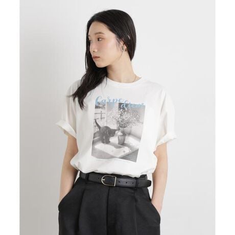 モノクロのフォトグラフィックに、手書きタッチのロゴやメッセージを重ねたオリジナルプリントTシャツ。抜け感のあるデザインで、ラフさの中に程よいこなれ感をプラスした一枚です。