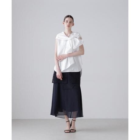 スクエア型のレース素材と透け感のあるシフォン素材を重ねたレイヤースカートです。