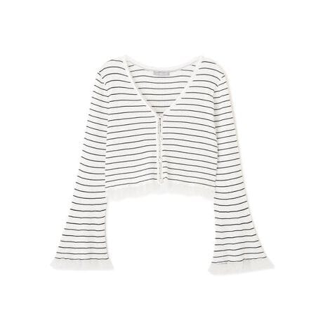 襟、袖口、裾のシアートリムがポイントのショートカーディガン。軽やかな素材が女性らしい抜け感を演出します。コンパクトな丈感で、ワンピースやハイウエストボトムスと相性バツグン。羽織るだけでコーディネートを華やかに見せるデザイン。ロングシーズン着用でき、デイリーに活躍します。※撮影時照明の関係により、色味が違って見える場合がございます。またパソコン・スマートフォンなどの環境により、若干製品と画像のカラーが異なる場合もございます。予めご了承ください。商品の色味は、商品単品画像をご参照下さい。※商品画像はサンプルのため、色味やサイズ等の仕様に変更がある場合がございますので、予めご了承ください。