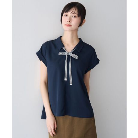 結び方で印象自在に変わるモードなリボンブラウスストライプリボンが印象的なブラウス。