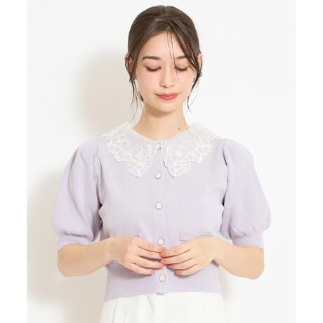 繊細なディテールが映えるシアーレースカラーカーディガン【Design】・透け感のあるレース素材が軽やかな印象を与えるカーディガン。・花柄刺繍にパールをちりばめたシアーレース襟が華やかなアクセントになり、顔まわりをやさしく彩ります♪・フェイクポケットをあしらい、さりげないアクセントをプラス。・トップスとして一枚で着映えし、コーディネートの主役になるアイテムです!【Fabric】・軽やかで繊細なシアーレース素材を使用。・さらっとした着心地で、シーズンライクに着こなせます。・ご自宅でお手入れが出来るのも嬉しいポイント♪・ホワイト、ライム、ラベンダー、ネイビーの4色展開となります。【Care】手洗い可能