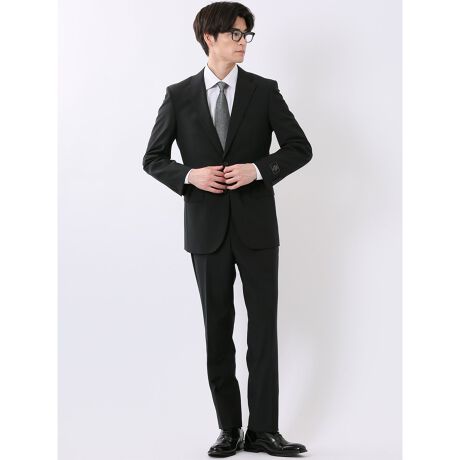 ウール混 ストレッチ スリムフィット 2ボタン 2ピース スーツ 無地 黒