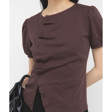 昨年ご好評いただいていたアシメトリーデザインカットソーが今年も登場。フロントのアシンメトリーデザインが特徴的なカットソーになっており、左右で着丈を変え、釦を閉めていただくとタックのようなデザインになります。女性らしいパフスリーブや、くるみ釦もポイント。ボリュームボトムと相性が良く、下の釦を2つほど開けて着ていただくのがおすすめです。
