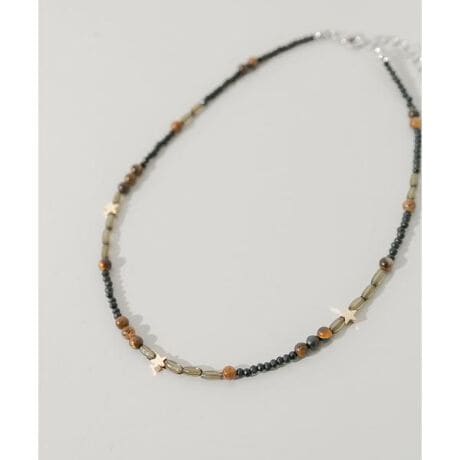 落ち着いたトーンのビーズの中に、キラリと光るスターモチーフを散りばめ、大人の遊び心をプラスしました。
