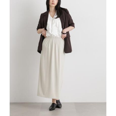 落ち感のきれいなレーヨン混カットソー素材で仕立てたIラインスカート。快適な穿き心地と上品なルックスを兼ね備え、シーズンレスで活躍する一枚です。