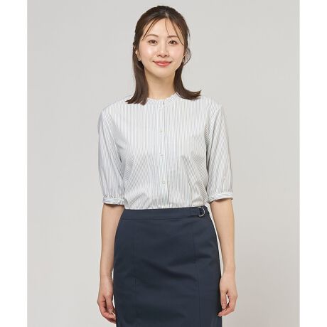 お顔周りを華やかに彩るクラシカルなフリル襟と、フロントに施した繊細なピンタックが女性らしさを引き立てるブラウス。気になる二の腕をしっかりとカバーしてくれる安心の5分袖ながら、袖口の下部分にゴムを入れることで、窮屈感のないリラックスした着心地を実現しました。1枚でもサマになるデザインながら、ジャケットインにも映える上品なバランスに仕立てています。程よくゆとりのあるシルエットは動きやすく、デイリーから通勤まで幅広いシーンで着回せる優秀なアイテムです。