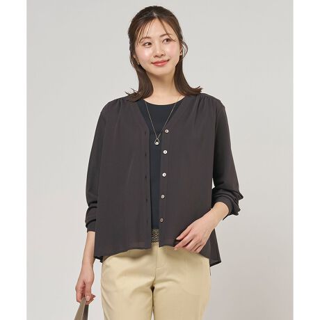 ■デザインすっきりとしたVネックのカーディガン。肩の切り替え部分や背中にたっぷりとギャザーを施した、動くたびにふんわりと揺れる女性らしいシルエットに仕上げました。袖口はきちんとした印象のカフス仕様になっており、折り返して袖の長さを調整できるのも嬉しいポイントです。タンクトップの上にさらりと羽織るだけで、トレンド感のあるレイヤードスタイルが完成します。暑い季節の冷房対策や、日差しが気になる時のお出かけにも重宝します。カラーは、清潔感があり顔周りを明るく見せるホワイト(#001)、肌なじみが良く上品で柔らかな印象のグレージュ(#033)、シックで落ち着きのあるチャコールグレー(#035)、知的で上品な印象のネイビー(#075)の4色展開です。