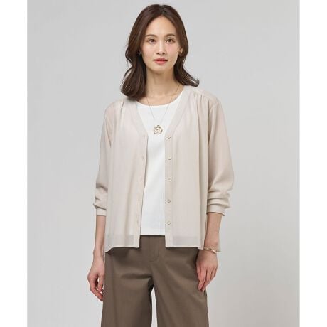 ■デザインすっきりとしたVネックのカーディガン。肩の切り替え部分や背中にたっぷりとギャザーを施した、動くたびにふんわりと揺れる女性らしいシルエットに仕上げました。袖口はきちんとした印象のカフス仕様になっており、折り返して袖の長さを調整できるのも嬉しいポイントです。タンクトップの上にさらりと羽織るだけで、トレンド感のあるレイヤードスタイルが完成します。暑い季節の冷房対策や、日差しが気になる時のお出かけにも重宝します。カラーは、清潔感があり顔周りを明るく見せるホワイト(#001)、肌なじみが良く上品で柔らかな印象のグレージュ(#033)、シックで落ち着きのあるチャコールグレー(#035)、知的で上品な印象のネイビー(#075)の4色展開です。