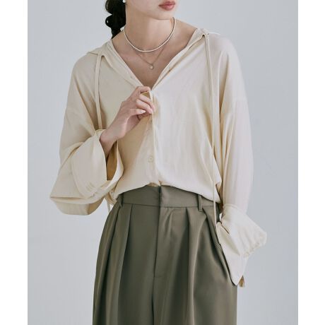 etoll. エトル アウターにもトップスにもなってくれる、透明感とマニッシュな印象を掛け合わせたシアーのフードシャツ。