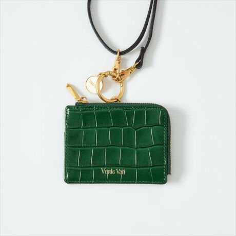 片側のウォレットポーチは、濃淡さまざまなグリーンに染め上げたクロコダイル型押しの牛革を使用し、奥行きのある表情と上質な艶感を演出しました。