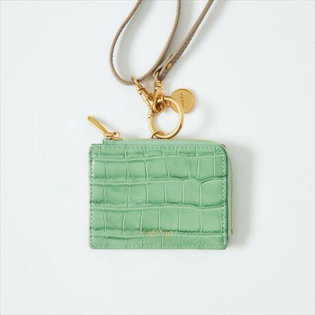片側のウォレットポーチは、濃淡さまざまなグリーンに染め上げたクロコダイル型押しの牛革を使用し、奥行きのある表情と上質な艶感を演出しました。