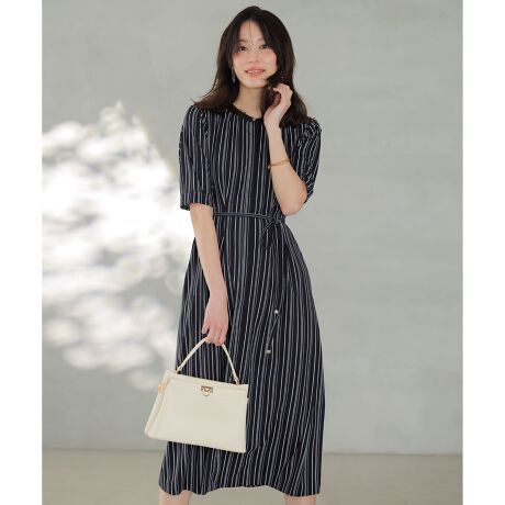 ・上品な印象の落ち感が美しいジョーゼットジャージワンピース・比翼仕立ての前立てに薄金の金属ボタンを効かせ、きちんと感の中にさりげない華やかさをプラス・ベルト先にも薄金のワニカンを使用し、細部まで上品さにこだわった仕上がり・縦ラインを強調するタックデザインで、すっきりとしたシルエットを演出