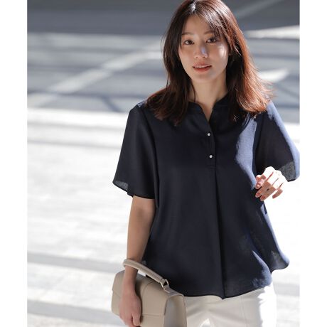 ・オンオフ両方で使えるシンプルさの中に、着るだけで今っぽく見せてくれるデザイン性をプラス・涼しげなスキッパー開きに、上品なパール調ボタンがアクセント・程よい長さのフレア袖は日除け対策や二の腕カバーに重宝し、ひらっとした袖で涼しげな印象・インでもアウトでも着やすい前後差のある着丈で、程よくヒップをカバー・脇スリット入りで、アウトでも可愛く、インもしやすいデザイン・後ろネック部分にギャザーを入れ、後ろ姿も可愛く・オンにもオフにも活躍する万能ブラウス