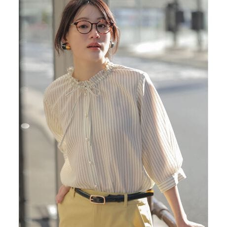 ス #フリルネック #ブラウス #パールボタン #前後着用 #2WAY #羽織り #オフィスコーデ #ストライプ #通勤 #きちんと感 #着回し #きれいめ #オフィス #オフィススタイル #オフィスカジュアル #お仕事コーデ #上品 #洗える #ウォッシャブル