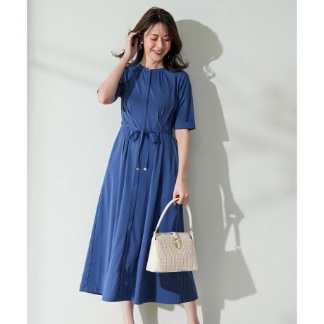・上品な印象の落ち感が美しいジョーゼットジャージワンピース・比翼仕立ての前立てに薄金の金属ボタンを効かせ、きちんと感の中にさりげない華やかさをプラス・ベルト先にも薄金のワニカンを使用し、細部まで上品さにこだわった仕上がり・縦ラインを強調するタックデザインで、すっきりとしたシルエットを演出