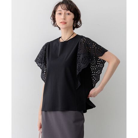 シンプルな身頃に、大柄のスカラップ刺繍を施した袖をドッキングさせた華やかなトップスです。袖にはたっぷりと分量を持たせつつ、大胆なカットワーク刺繍を施すことで、軽やかで涼しげな印象に仕上げました。気になる二の腕をふんわりとカバーするのもうれしいポイント。一枚着るだけで洗練されたコーディネートが華やぎ、デニムやワイドパンツと合わせて大人のカジュアルスタイルを楽しむのはもちろん、テーパードパンツやスカートと合わせればお出かけシーンにも活躍します。 カラーは、爽やかで万能なホワイト(#001)、シックでモダンな印象のブラック(#005)、肌馴染みが良く上品なキャメル(#034)、落ち着いた雰囲気のダークブラウン(#035)の4色展開です。