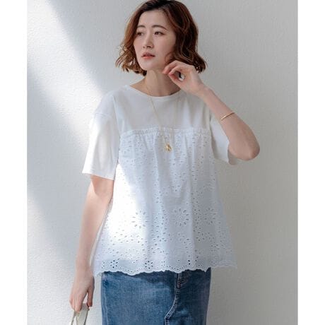 表面がクリアで滑らかなジャージー素材を使用しています。適度な肉感があるため体のラインを拾いにくく、安心してご着用いただけます。切り替え下のペプラム部分には、繊細な穴あき模様が特徴のカットワークレース生地を組み合わせました。リラックス感のあるカットソー素材と、きちんと感のあるシャツのような素材のコントラストが、上品で高見えするスタイルを演出します。