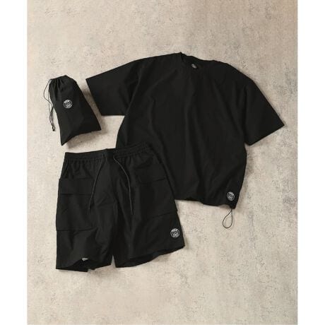 Tシャツ、ショーツ、そしてそれらをコンパクトに収納できるスタッフサック(巾着)。これひとつでコーディネートが完結し、あらゆるシーンへ軽やかに飛び出せる、真のユーティリティウェア。