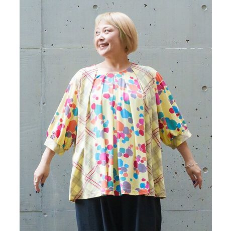 華やかなちぎり絵モチーフと、落ち着きのあるチェックを掛け合わせたオリジナルプリントトップス。
