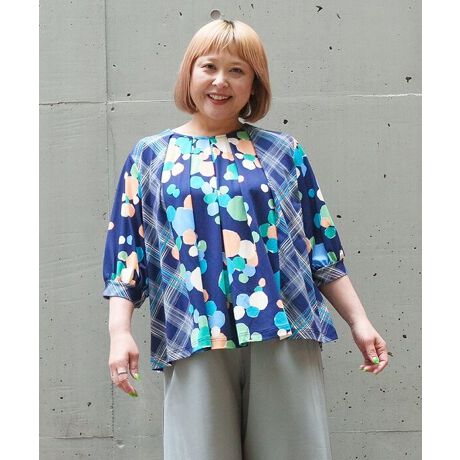 華やかなちぎり絵モチーフと、落ち着きのあるチェックを掛け合わせたオリジナルプリントトップス。
