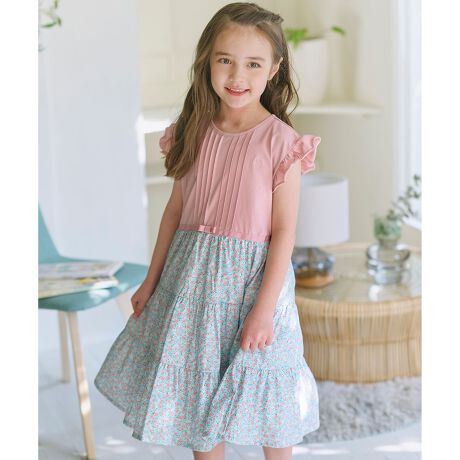 ■デザインフロントにタックをあしらったブラウスと、花柄スカートを合わせたようなドッキングワンピースです。ティアードデザインのスカート部分は、歩くたびにふんわりと広がり、思わずくるくると回りたくなるようなロマンティックなシルエットに仕上げました。