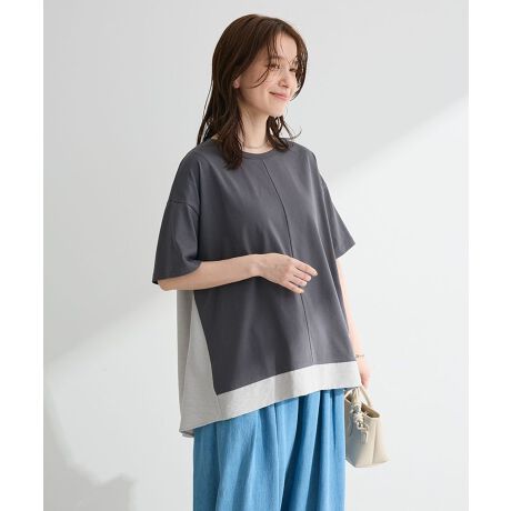 シンプルな中にデザイン性を感じられるドッキング仕様で、さっと着るだけでこなれた印象に仕上がる一枚です。バックタックが生み出すふんわりとしたシルエットは動くたびに揺れ、女性らしいやわらかな雰囲気を演出します。前後差のある丈感はスタイリングに奥行きを与え、体型カバーにも役立ちます。異素材の切り替えが程よいアクセントになり、シンプルなボトムと合わせるだけでバランスよく決まります。デイリー使いしやすく、幅広いシーンで活躍する頼れるアイテムです。