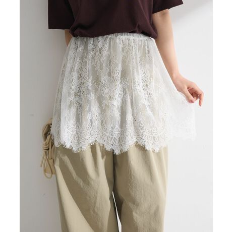繊細なひげレースが印象的で、軽やかに揺れるシルエットが女性らしさを引き立てる一枚です。透け感のあるレース素材が重たくなりがちなコーデに抜け感をプラスし、季節感のある装いに仕上げてくれます。ウエストはゴム仕様で、リラックスした穿き心地も魅力です。パンツやデニムとのレイヤードスタイルはもちろん、ワンピースの上から重ねるだけで旬な着こなしが完成します。シンプルなトップスと合わせるだけで、華やかさと上品さを兼ね備えたスタイルが楽しめます。