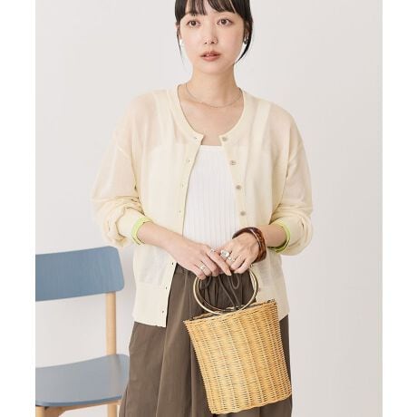 さらりとした着心地がこれからの季節に嬉しい、シアー素材のニットカーディガン。袖口に施した配色デザインが、シンプルなスタイリングのアクセントになります。透けすぎない上品なシアー感なので、オフィスから休日のお出かけまで幅広く活躍。冷房対策や日除けとして、バッグに一枚忍ばせておける優秀アイテムです。