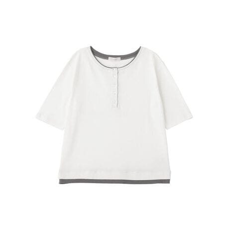 シンプルなデザインに配色のアクセントを効かせた、着回し力の高い半袖プルオーバーです。ヘンリーネックのボタンディテールが程よい抜け感を演出し、顔まわりをすっきりと見せてくれます。さりげなく重ねたようなレイヤード風デザインは、一枚でコーディネートに奥行きをプラスできるのが魅力です。やわらかな素材感で着心地もよく、リラックスしたシルエットが体のラインを自然にカバーします。デニムやスカートなど幅広いボトムと相性がよく、日常のカジュアルスタイルに上品さを添えてくれる一枚です。
