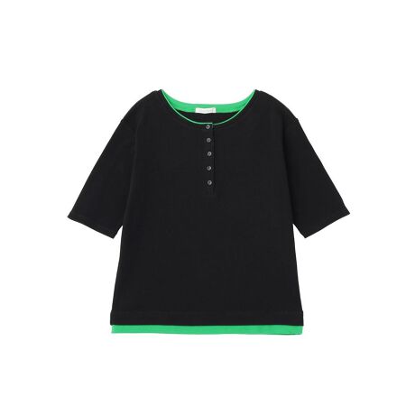 シンプルなデザインに配色のアクセントを効かせた、着回し力の高い半袖プルオーバーです。ヘンリーネックのボタンディテールが程よい抜け感を演出し、顔まわりをすっきりと見せてくれます。さりげなく重ねたようなレイヤード風デザインは、一枚でコーディネートに奥行きをプラスできるのが魅力です。やわらかな素材感で着心地もよく、リラックスしたシルエットが体のラインを自然にカバーします。デニムやスカートなど幅広いボトムと相性がよく、日常のカジュアルスタイルに上品さを添えてくれる一枚です。