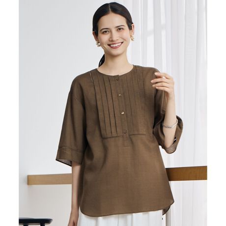 ラフさと上品さを兼ね備えた毎日着たくなるブラウス■デザインTブラウス感覚で気軽に着用いただけるデザインブラウスです。前身頃のタックデザインがアクセントとなり、顔まわりを華やかな印象に演出します。タック周りと袖の切り替え部分にははしご刺繍を施し、カジュアルさの中にも上品さを感じさせる一枚に仕上げています。程よくゆとりのあるシルエットで、体のラインを拾いにくいのも嬉しいポイントです。■素材昨年ご好評いただいたナチュラルリネンと同生機を使用し、弱ソフト加工に加え、吸水速乾・接触冷感の機能をプラスした素材です。日本有数の先染め織物産地である西脇地方で織り上げた、上質な平織り生地になります。再生繊維(セルロース)とリネンを特殊な混紡糸で使用することで、セルロース特有のさらりとしたドレープ性に、リネンならではのナチュラルな表情と上品な光沢感を兼ね備えています。それぞれの素材の長所を掛け合わせた、バランスの良い風合いが魅力です。また取り扱いやすさも魅力です。家庭洗濯が可能で、暑い時期にも快適に着用いただける、吸水速乾・接触冷感機能付き素材です。■同素材シャツ(BLWMLM0510)