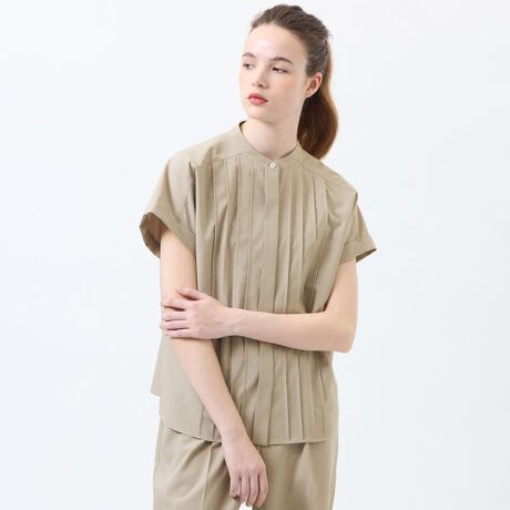 胸元のピンタックがポイントのフレンチスリーブブラウス。スタンドカラーで顔周りをすっきりと見せながらきちんと感もプラス。