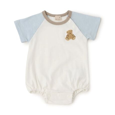 配色のラグランデザインとモチーフ刺しゅうが可愛いロンパースです。デイリーに着回しやすいナチュラルな色合いになっています。首元と股部分にはスナップボタンを配しており、おむつ替えや着脱がラクラク。裾口がゴム仕様で動きやすいのも魅力です。内側にお名前を記入できるタグつき。【おすすめの着用時期は春夏シーズン】