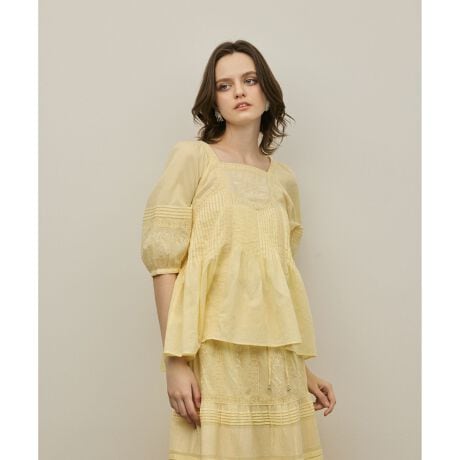 [型番:0126241109]インドならではの柔らかいコットンボイルを使用したブラウス。ふんだんに入れたピンタックと繊細な刺繍とレースが意匠性が高く華やかなデザイン。同シリーズでお作りした ピンタックティアードスカート【品番:0126221109】のご用意もございます。※こちらのモデル着用画像はサンプル品を撮影しております。実際の商品と仕様、加工、サイズが若干異なる場合がございます。予めご了承くださいませ。