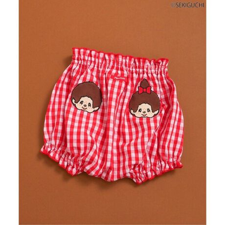 [型番:V339906]≪子供服 apres les coursの「モンチッチ」コレクション≫ギンガムチェックがレトロでかわいい♪「モンチッチ」のお顔をあしらったベビーブルマ。後ろ姿までかわいい一枚です。#apreslescours【サイズ情報】70-80:ウエスト幅20 足口幅11 腰幅48※商品により多少の誤差が生じる事がございます。あらかじめご了承下さい。※サイズは、平置きの状態で、商品の【外寸】を測定した物です。