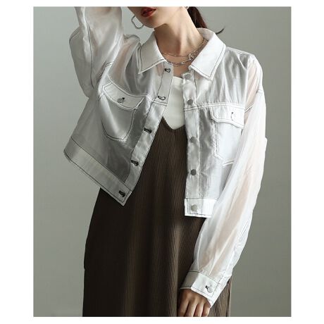 【アウター】 ジャケット シアー 長袖 フラップ 重ね着 ショート 羽織り Gジャン風 オフホワイト