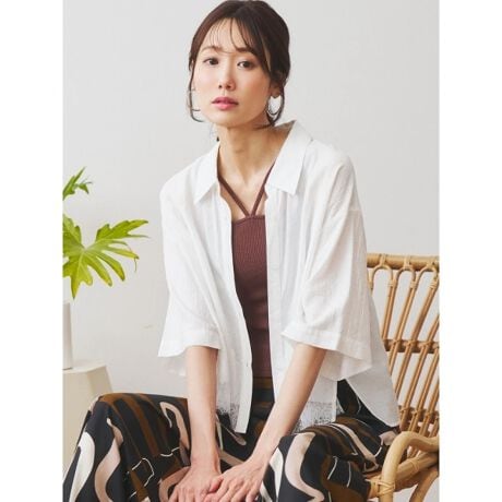 [型番:26550741422]裾のレース切り替えがさりげない透け感を演出するシャツ。レーヨンを含むさらりとした肌触りで、快適な着心地を実現します。ベーシックなレギュラーカラーがきちんと感をプラス。パンツと合わせたきれいめなコーディネートがおすすめです。モデル(白着用)身長:165cmMサイズ着用