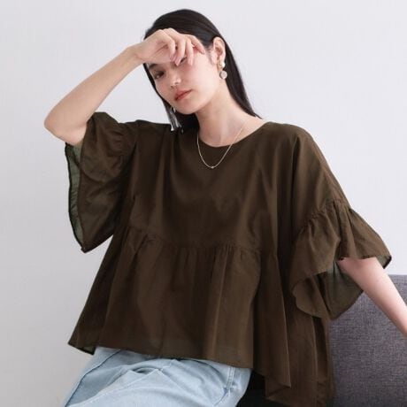 オーガニックコットン混の軽やか素材を贅沢に使用したフリルスリーブのペプラムブラウス